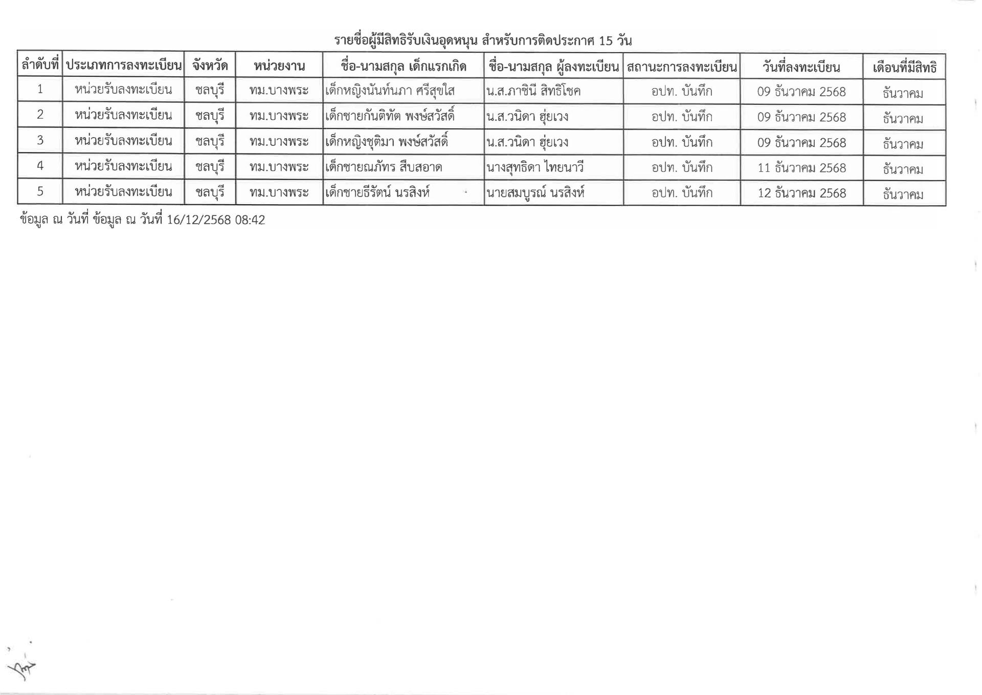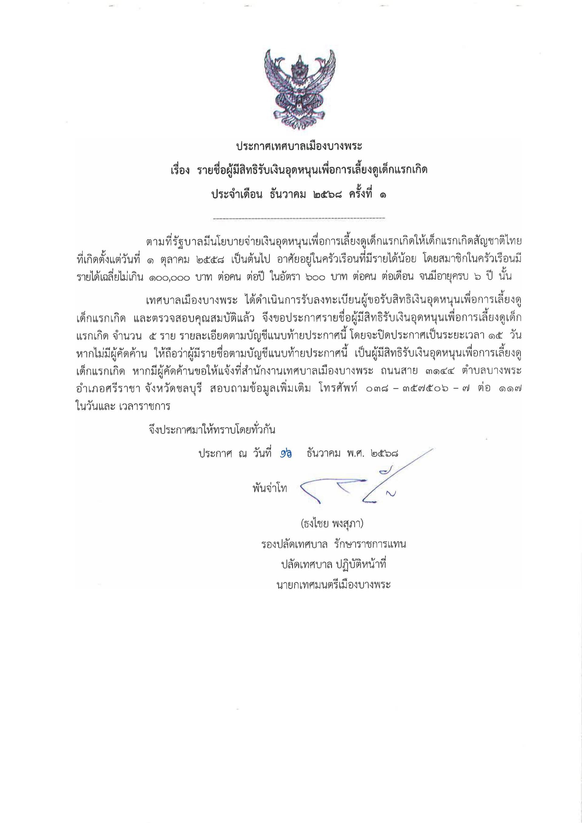 ประกาศเทศบาลเมืองบางพระ เรื่อง ประกาศรายชื่อผู้ขอรับสิทธิเงินอุดหนุนเพื่อการเลี้ยงดูเด็กแรกเกิด ประจำเดือนธันวาคม ครั้งที่ 1 (ลงวันที่ 16 ธันวาคม 2568) รายละเอียดเพิ่มเติมตามเอกสารแนบท้ายมานี้