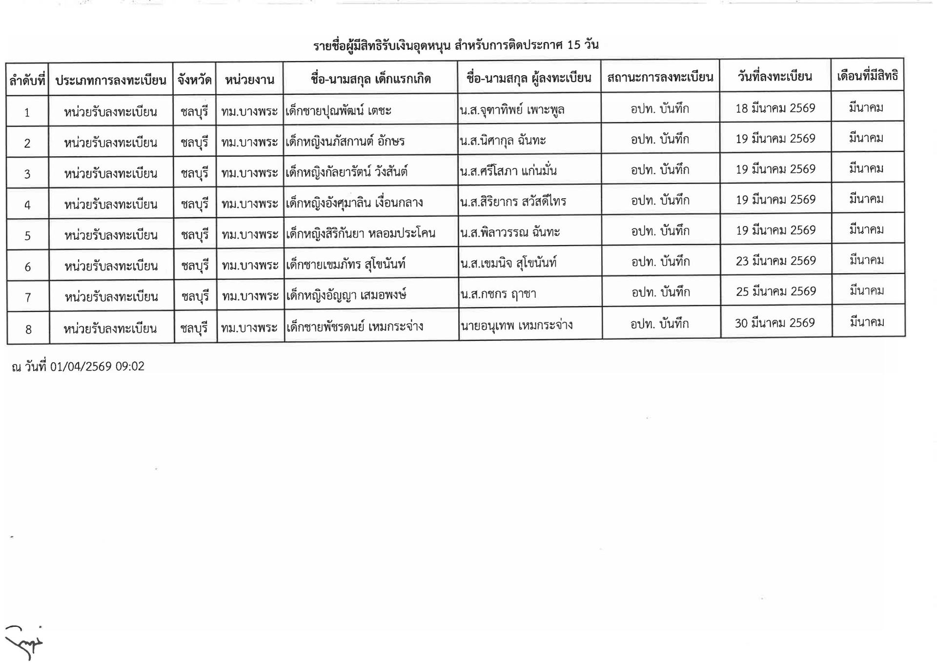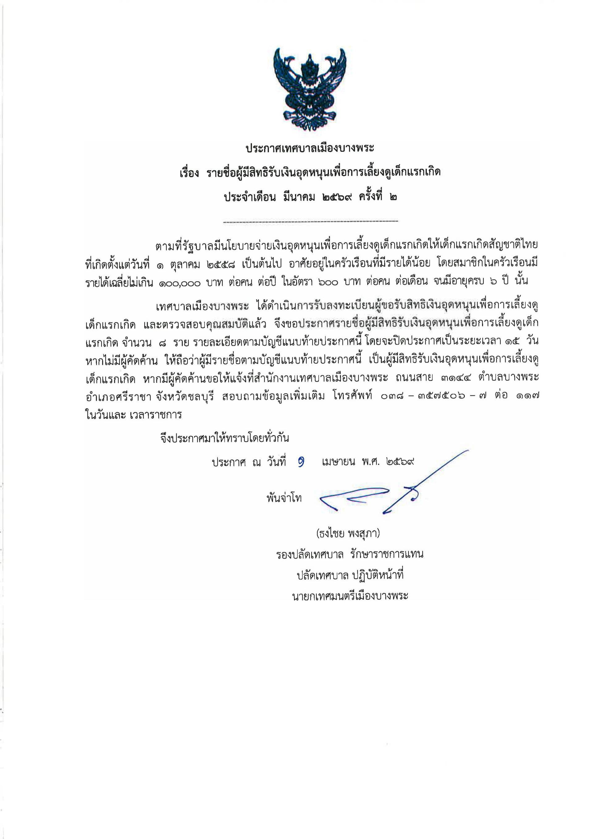 ประกาศเทศบาลเมืองบางพระ เรื่อง ประกาศรายชื่อผู้ขอรับสิทธิเงินอุดหนุนเพื่อการเลี้ยงดูเด็กแรกเกิด ประจำเดือนมีนาคม ครั้งที่ 2 (ลงวันที่ 1 เมษายน 2569) รายละเอียดเพิ่มเติมตามประกาศแนบท้ายมานี้